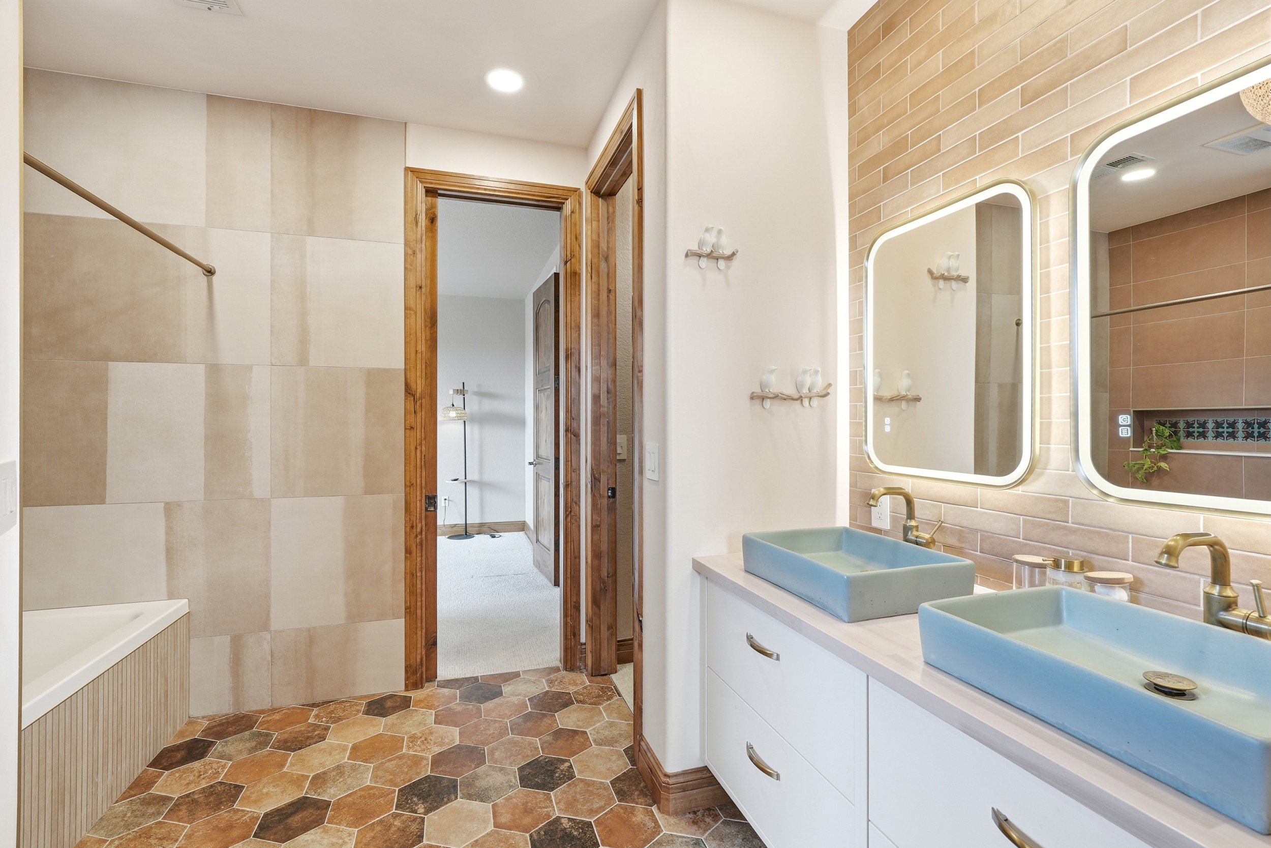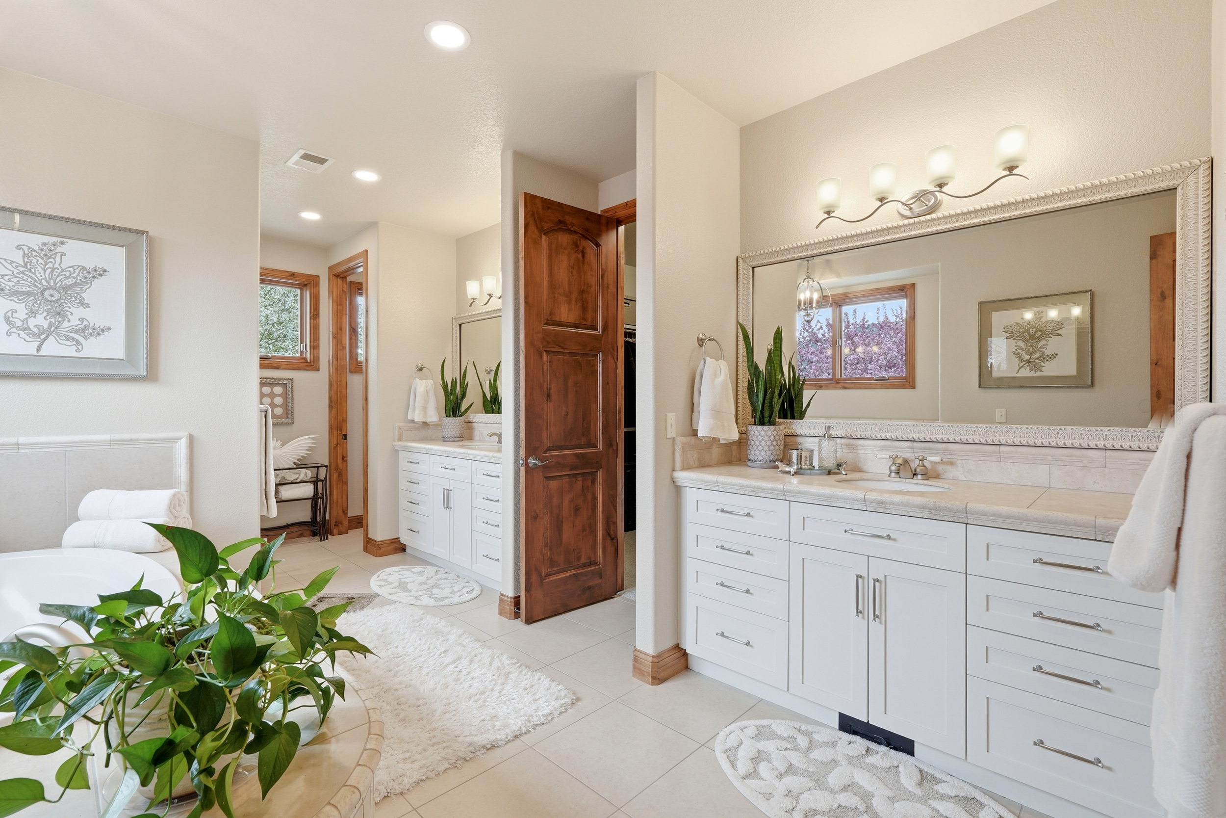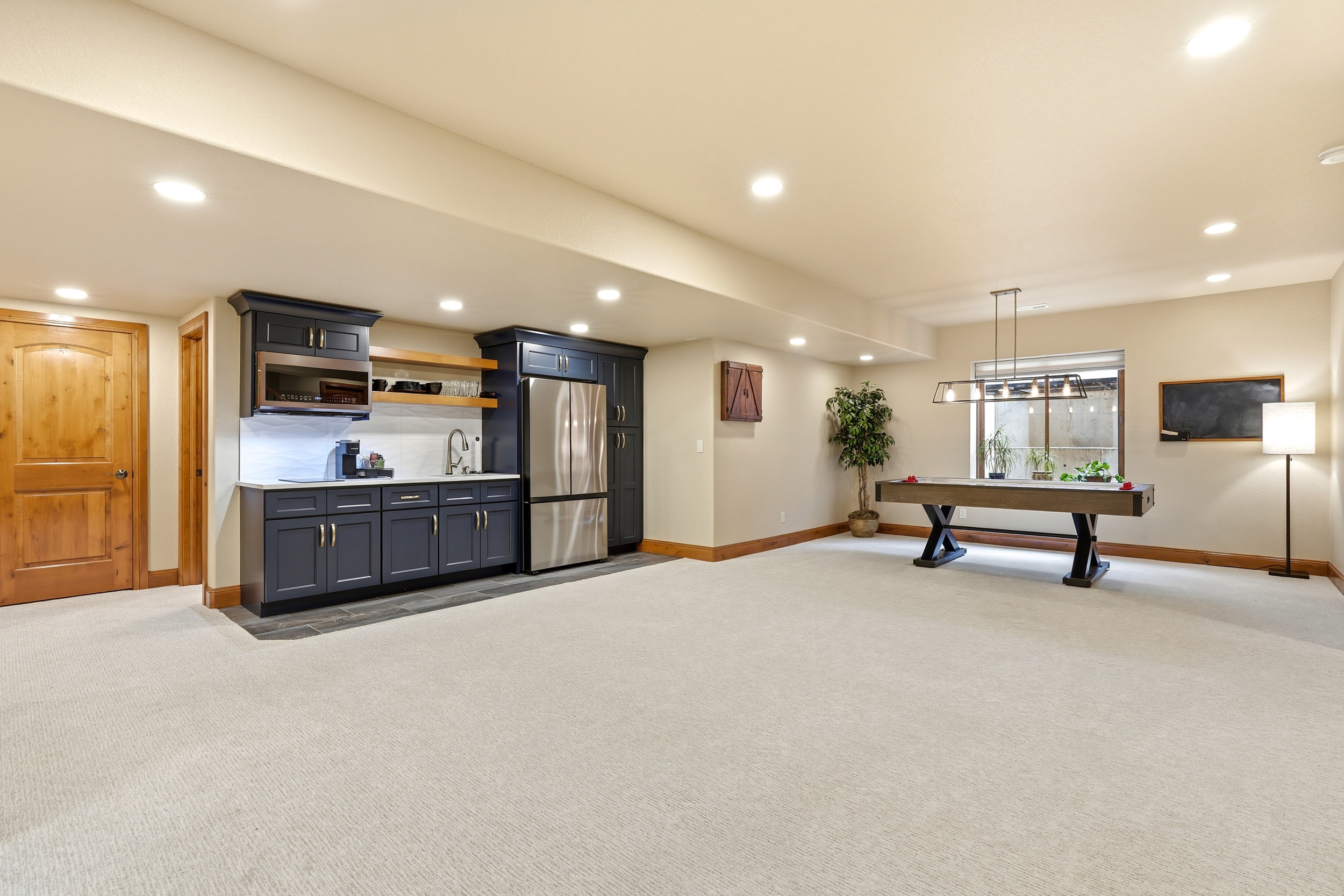 Finishing out the main floor is a generously sized bedroom with its own attached bath. Going upstairs, you will find four more bedrooms -- the regal primary suite, with truly spa-like finishes, a private bedroom with en suite bath, and two more bedrooms conjoined with a jack-and-jill style bath -- fully renovated & updated, and featuring a soaking tub. Enjoy a conveniently placed laundry shoot, as well as whole-house vacuum hookups in the upper level. Moving down into the newly finished basement, find two MORE bedrooms, an updated bathroom, as well as a proper exercise/workout space & a game room. Plenty of storage is also found in the lower level. The large, 3-car attached garage comes fitted with an EV charger. This opportunity in Rainbow Ridge does not come often -- strike while the iron is hot!