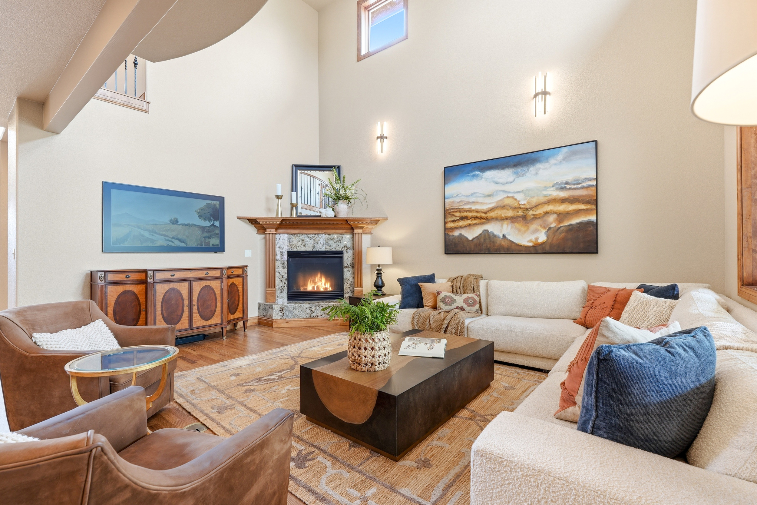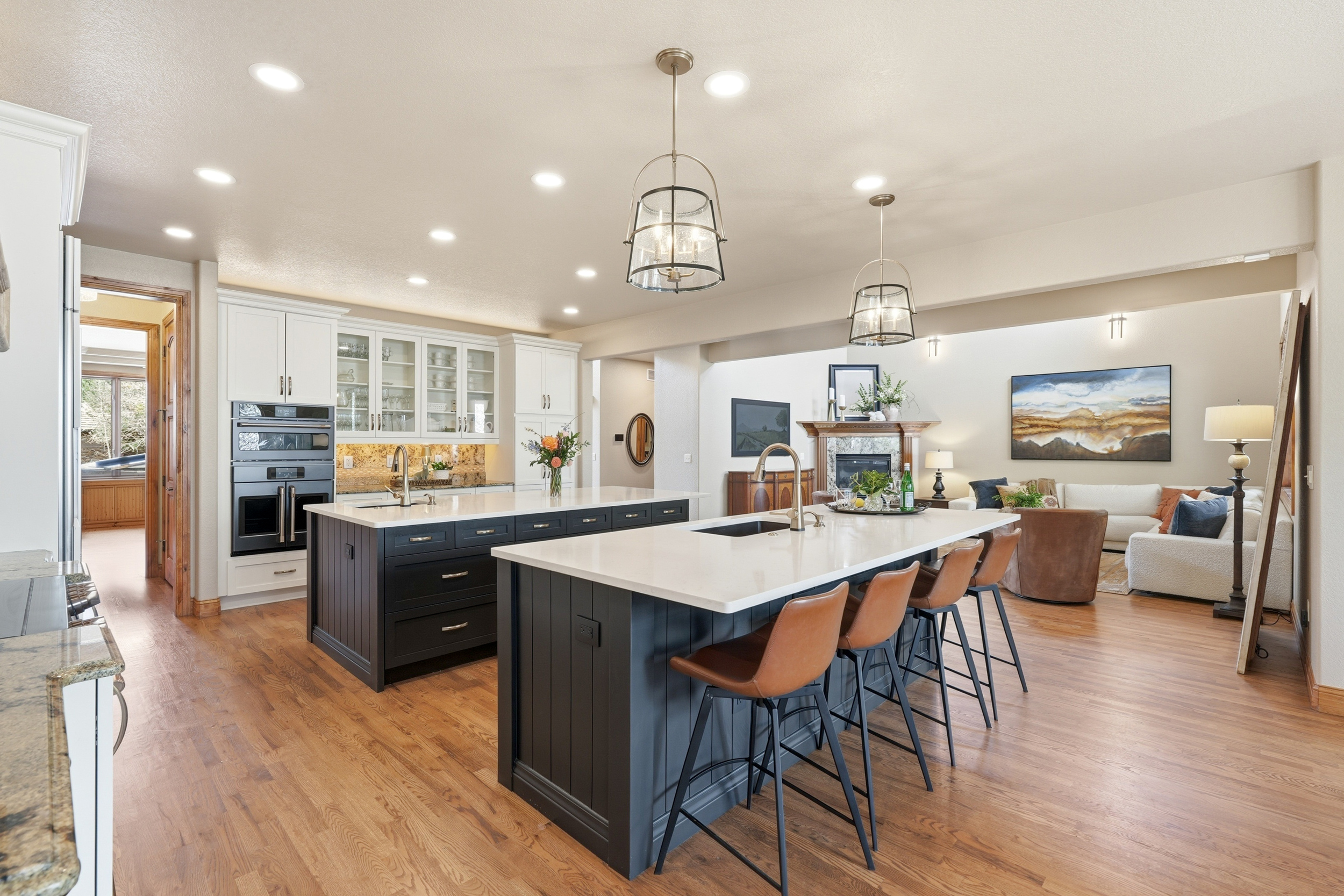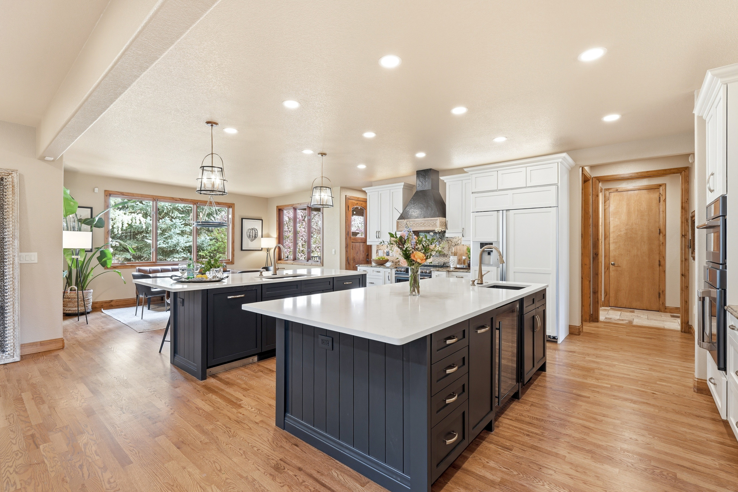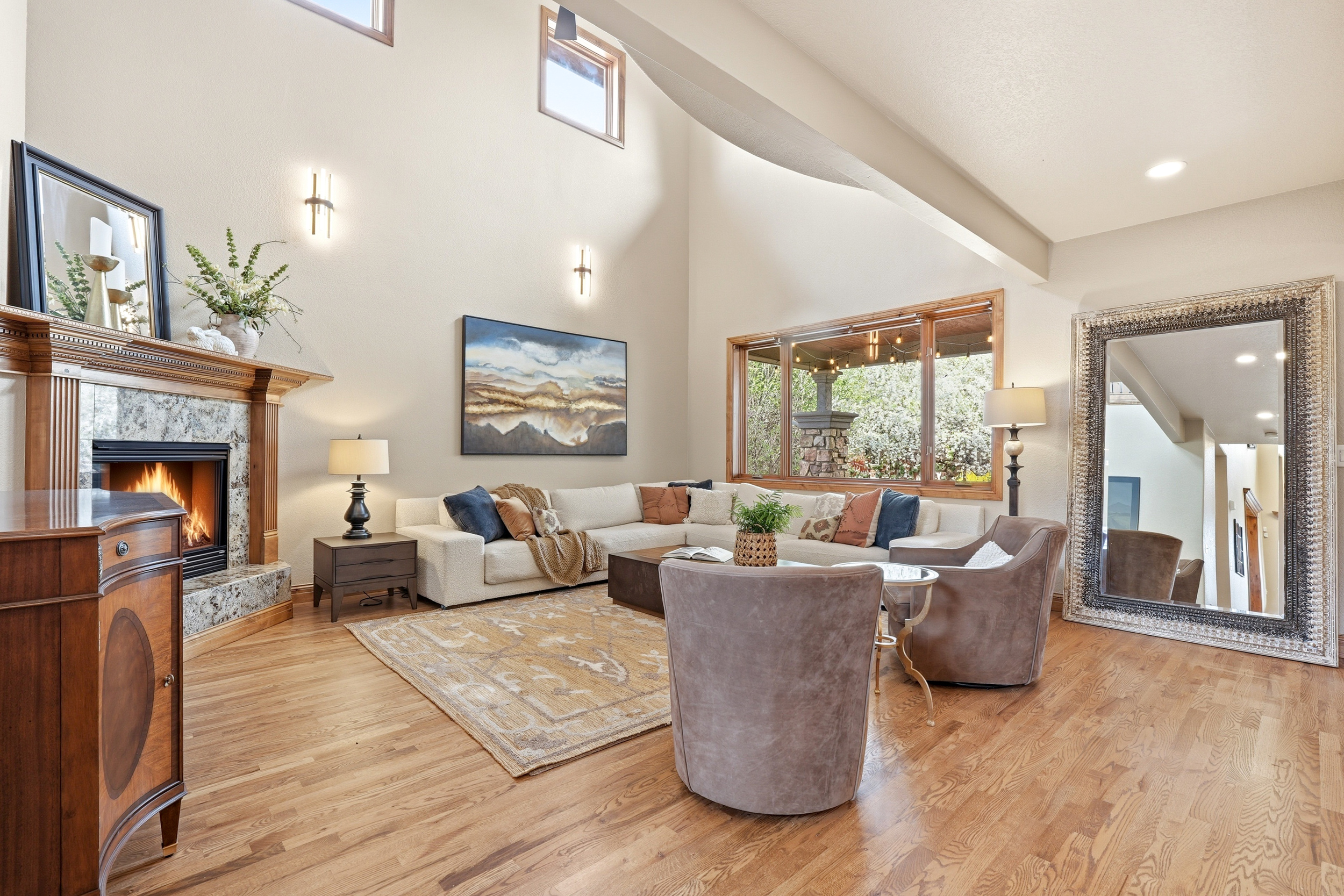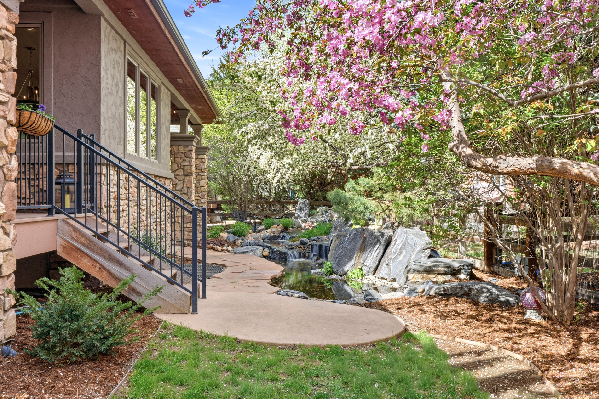 Beautifully renovated luxury home in sought-after Rainbow Ridge. This exceptional residence features soaring ceilings, abundant natural light, and a thoughtfully designed layout that blends elegance with everyday functionality. After major renovations & recent upgrades, the home presents beautifully. Mature flowering trees in the rear of the home coupled with a custom pond-like water feature creates a sense of tranquility and privacy. Multiple covered outdoor patio spaces on the front and rear of the home shelter one from the elements. Raised flower beds and a dog run on the side of the home are an added bonus. Coming inside, you're greeted with a formal sitting room/office space, equipped with a gas fireplace. Turn around, and find a formal dining room, with butler's pantry, wet bar, and convenient access to the gourmet kitchen. Kitchen is fitted with state-of-the-art appliances, two islands, and plenty of cooking space. Note, the current stove is electric, but there is a gas line located just behind it. A comfortable and casual eating space is presented in the kitchen, with an equally comfortable main floor living room.